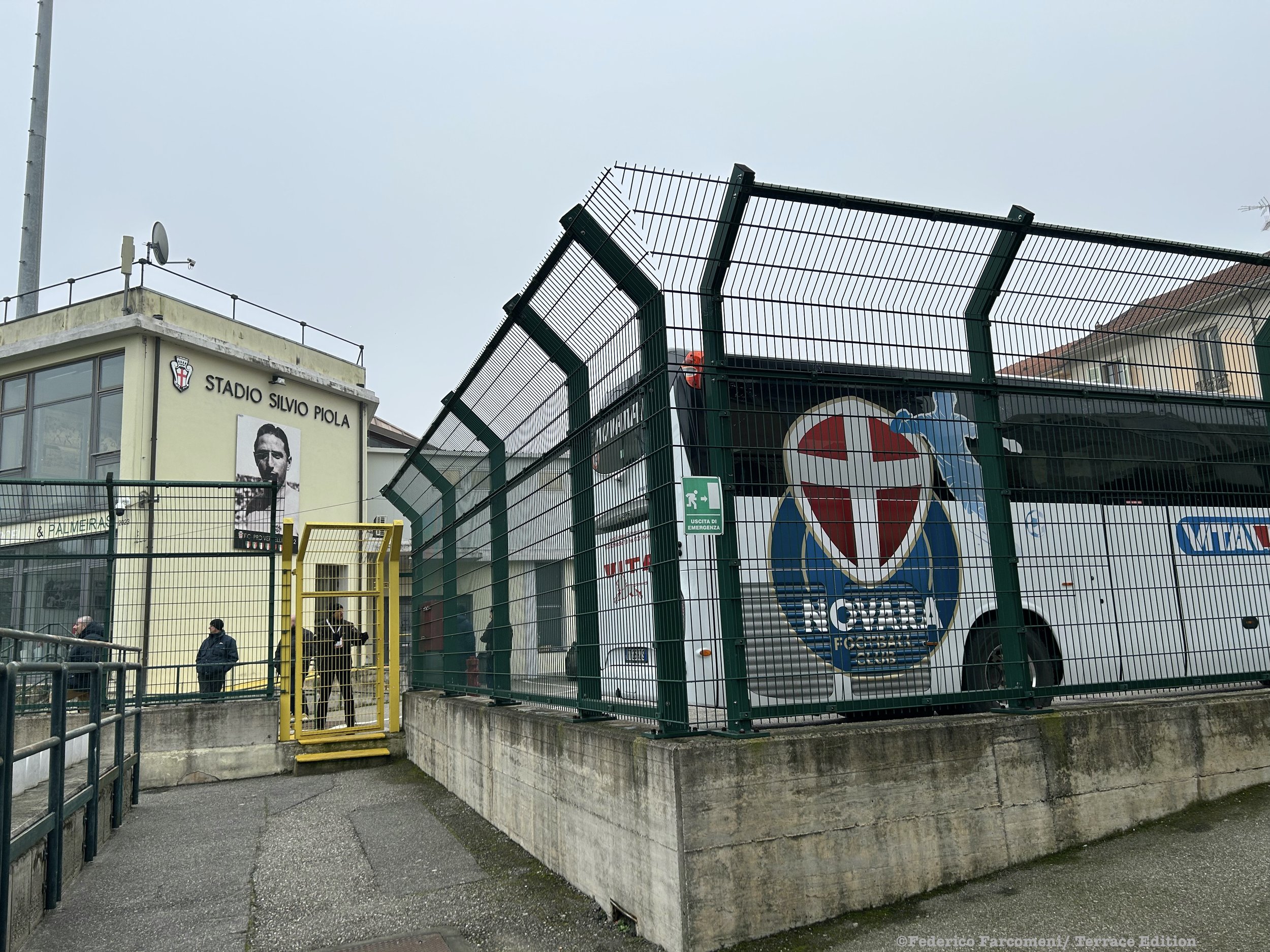 Nowadays, the capacity is 5,500 but the main stand (south) is what immediately catches the eye from outside and inside with its 1930s dusty grandeur which really goes hand in hand with the liberty style buildings behind the visiting supporters’ section where 532 Novara supporters have been escorted.