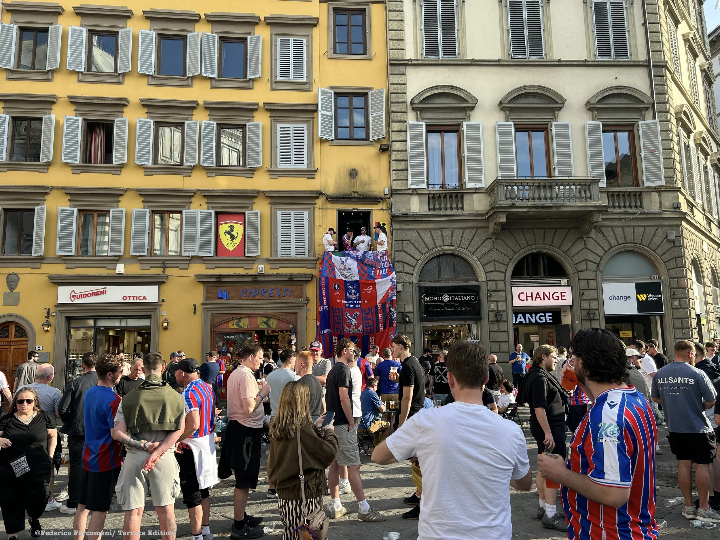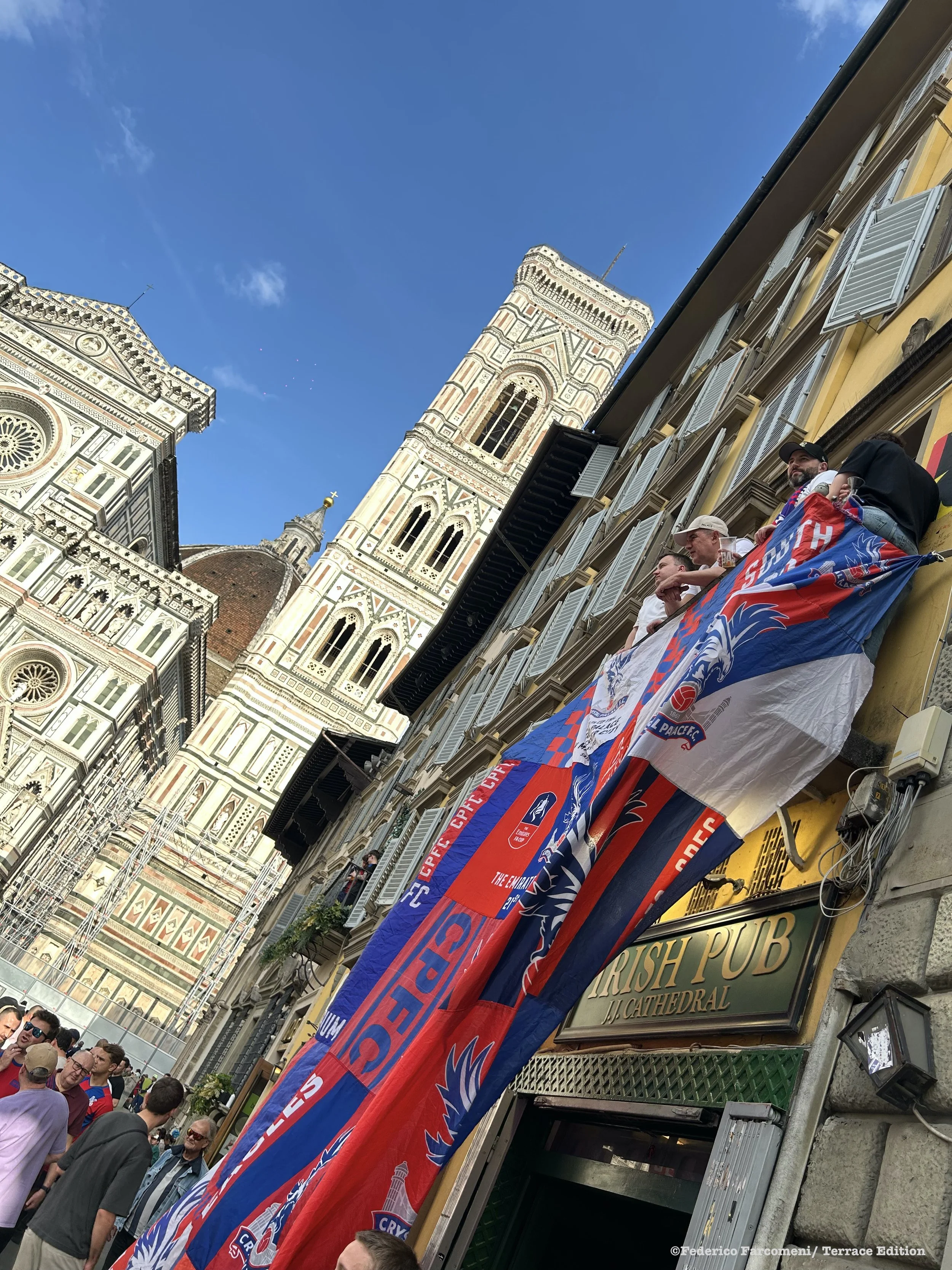 The main rendezvous for Palace fans was the main Duomo square at the JJ Cathedral Irish pub. Cult Palace man John Salako lead the chant of “Glad all over” in the early afternoon the corner of the square filled up with both people and expectation.