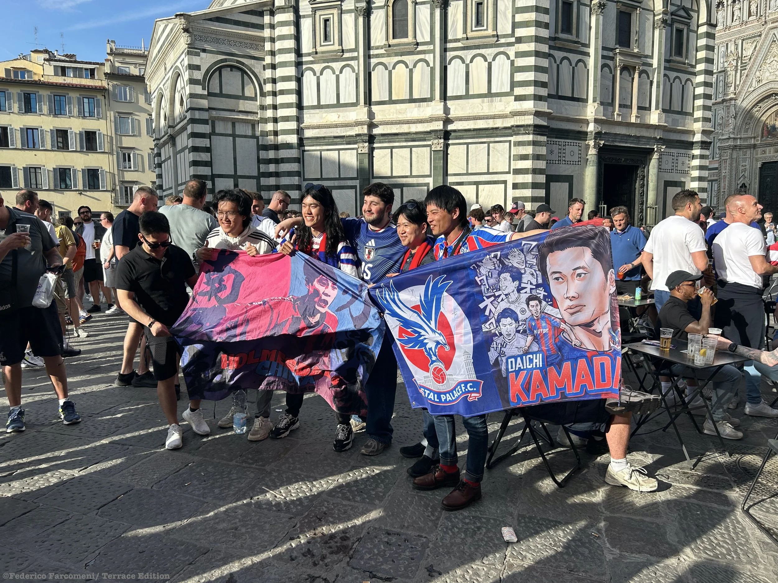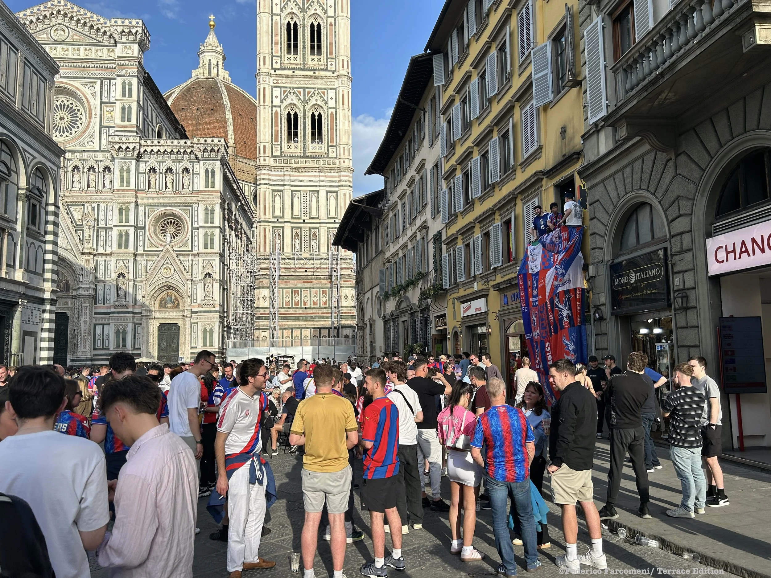 “Please stop it!” A cry comes from a Fiorentina fan sitting in the Tribuna Coperta as the Crystal Palace fans chant “We're on our way, we're on our way. To Leipzig, we're on our way.”
