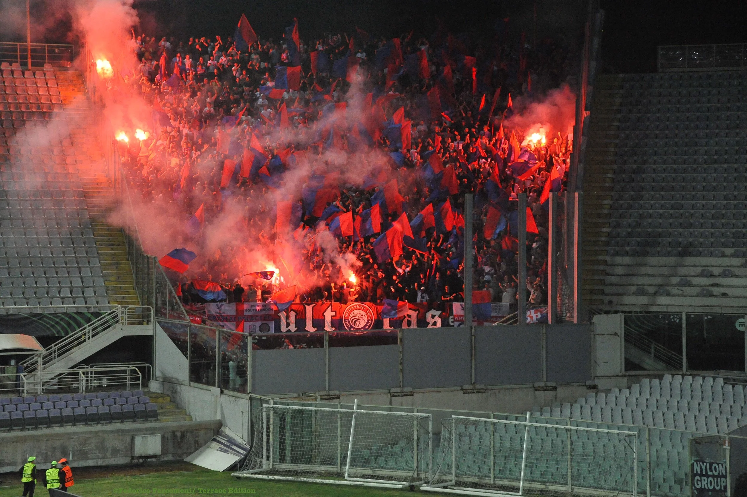 Once the match kicks off, chants also arise from another section of the ground where other 600 or so Palace fans are located, bringing the grand total to around 1,800 despite the restrictions as the Franchi is now a building site (in the league, no more than 300 away fans are actually allowed).